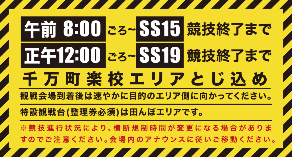 田んぼエリア( 南川沿い側)に分かれており、競技終了までSSコース上を横断できなくなる時間帯が発生します。