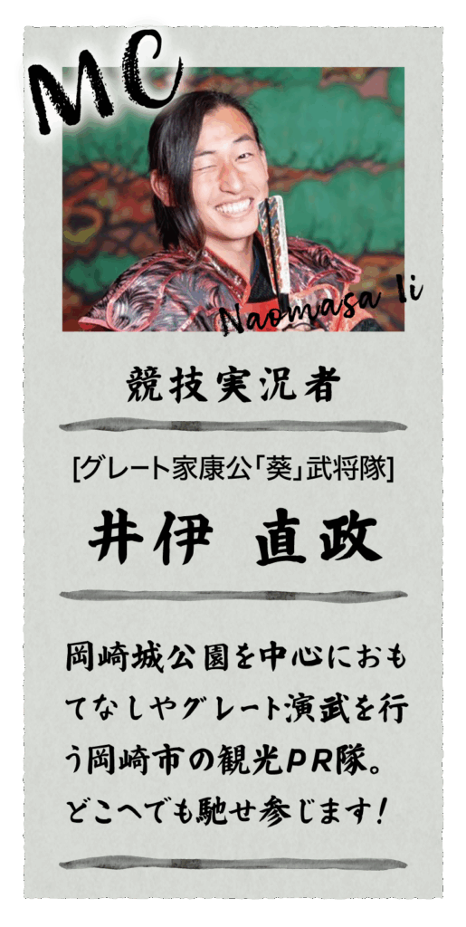 今年も実況にグレート家康公「葵」武将隊の井伊 直政さん、解説ゲストに槻島 もも選手、安藤 裕一選手が登場します!